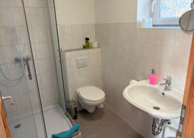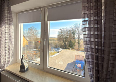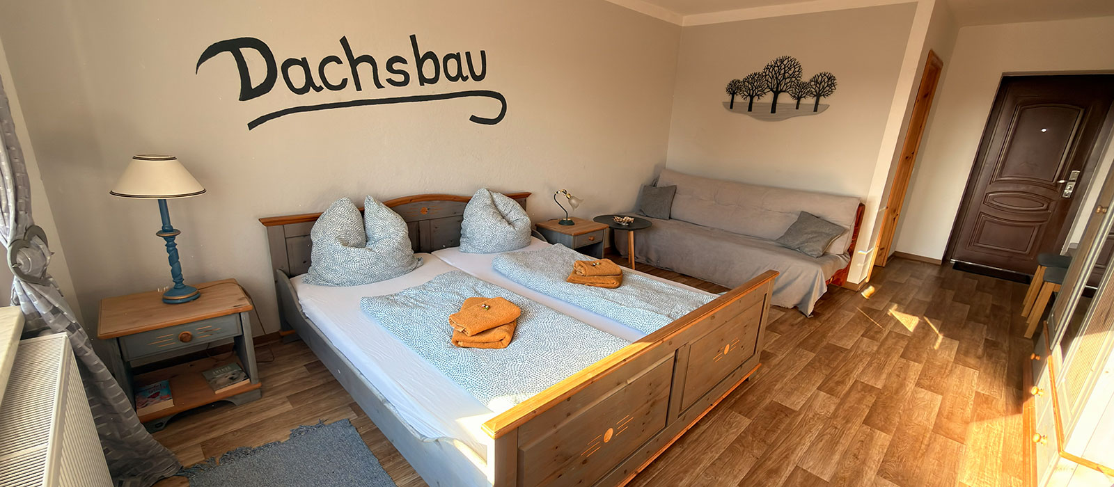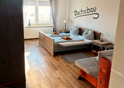 Der Dachs ist als einheimisches Wildtier auch im idyllischen Oderbruch beheimatet. Unser "Dachsbau" soll so gemütlich sein, wie die Höhle für einen Dachs. Das Zimmer ist in Vintage blau eingerichtet. An der Wand hängt ein selbstgemaltes Bild von 2 Dachsen vor ihrem Bau.