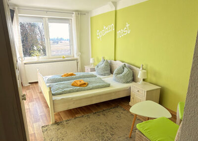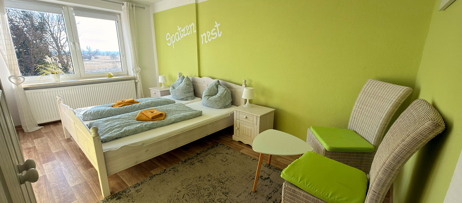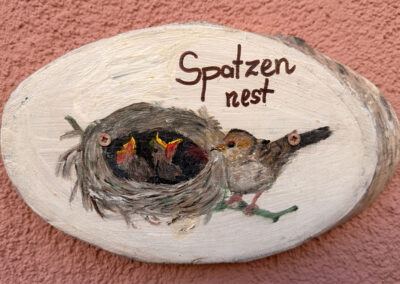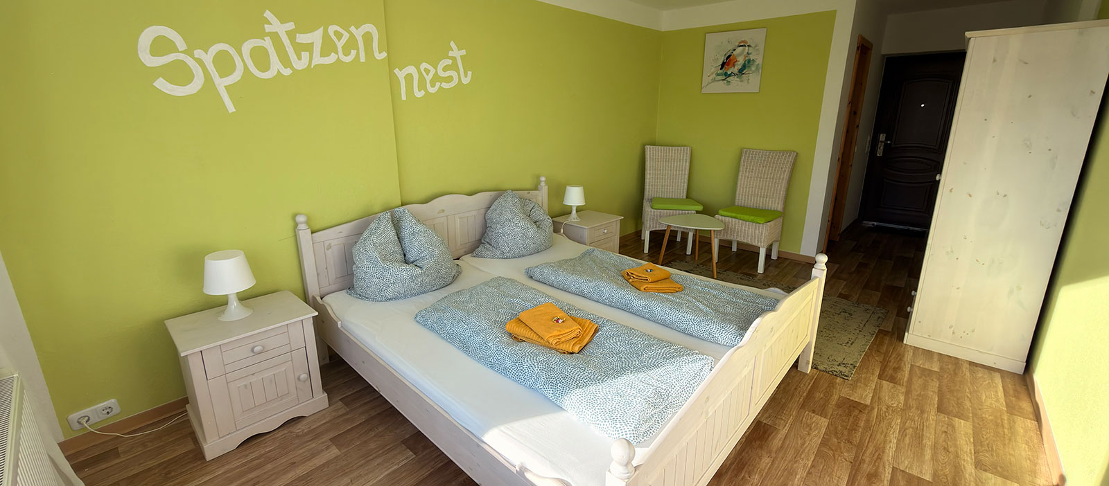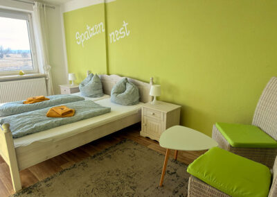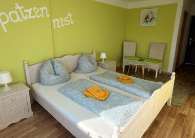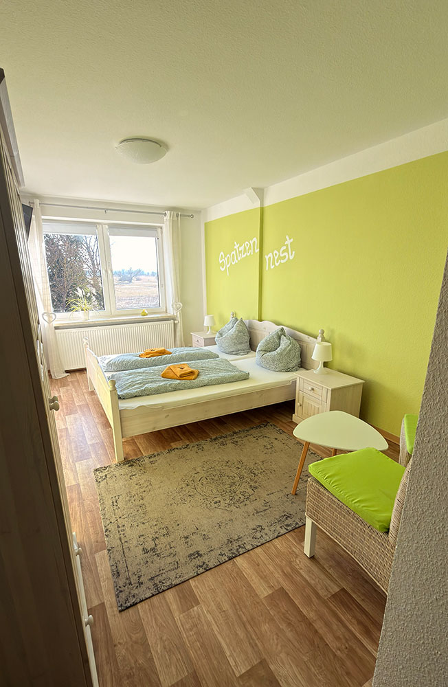 Unser SpatzennestIn unserem Spatzennest fühlt sich selbst der kleinste Spatz oder Spätzin wohl.Das Zimmer ist zwar etwas kleiner, dafür aber sehr gemütlich eingerichtet. Hellgrün und weiß dominieren den Raum. Unter der Markise vor dem Zimmer leben viele Spatzen.