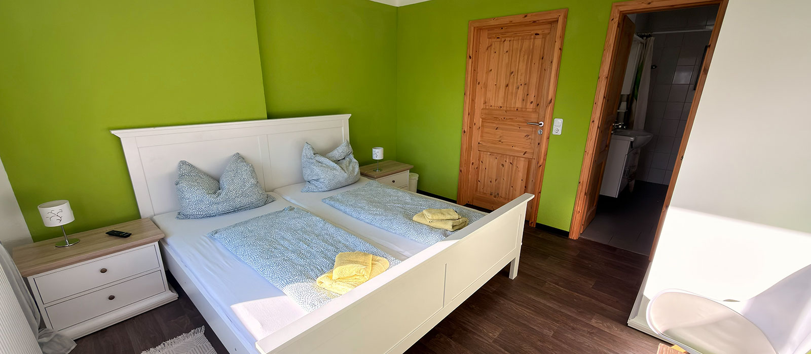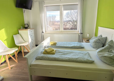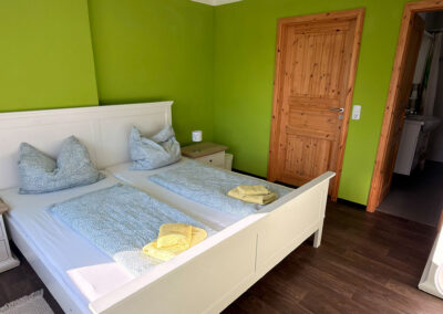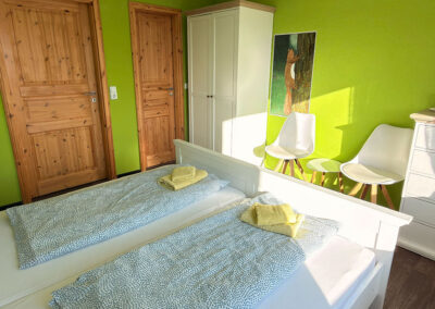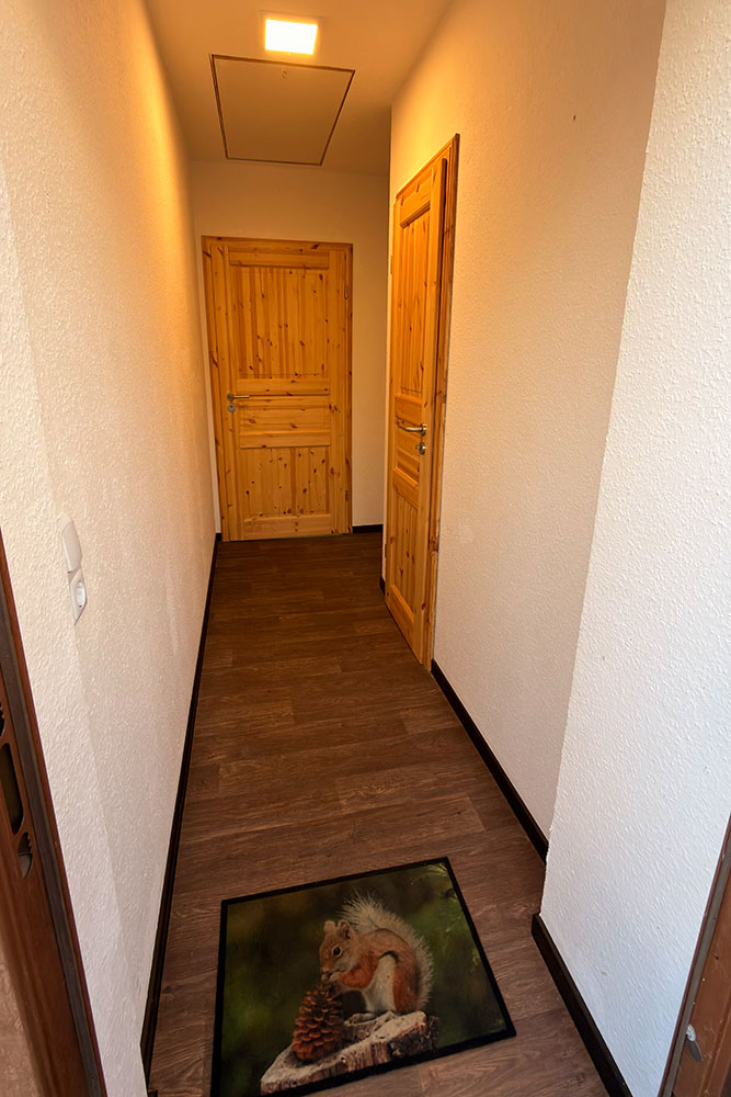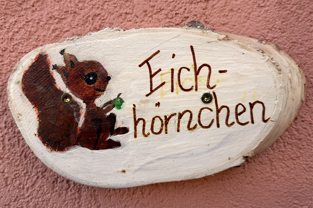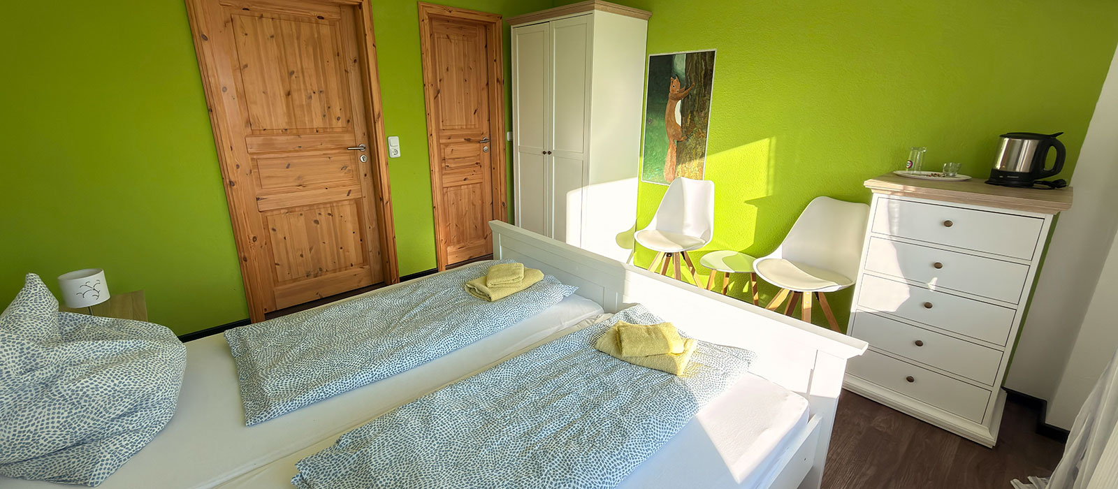 Das Zimmer ist modern und mit weißen Möbeln eingerichtet. Wenn man im gemütlichen Bett liegt, blickt man auf ein selbstgemaltes Bild von einem Eichhörnchen. Man hat das Gefühl, es bickt mich die ganze Zeit an... vielleicht?!
